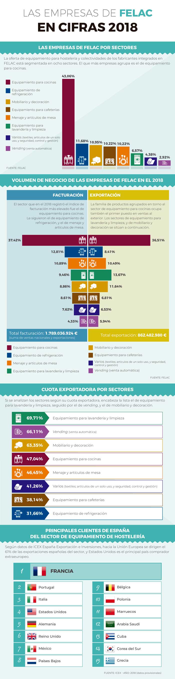 La facturación global de las 132 empresas de equipamiento para hostelería y colectividades, integradas en la Federación Española de Asociaciones de Fabricantes de Maquinaria para Hostelería, Colectividades e Industrias Afines (Felac), creció en 2018 un 4,84% hasta alcanzar los 1.789 millones de euros, consiguiendo así encadenar seis años de crecimiento. Son datos del estudio económico del ejercicio 2018 que anualmente elabora esta Federación.