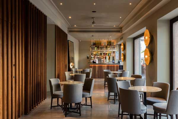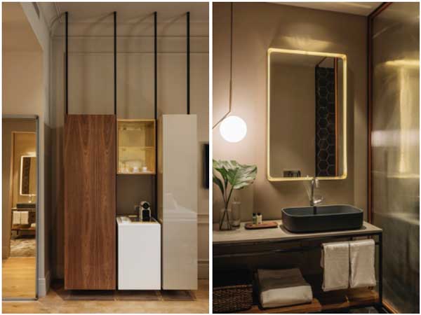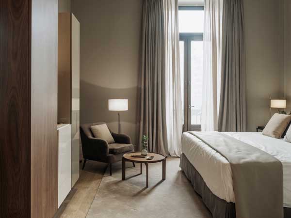 Su propuesta de interiorismo enfatiza la herencia de la arquitectura y al mismo tiempo crea una atmósfera elegante y atemporal en consonancia con el edificio y el emplazamiento. Por ello han elegido tonalidades oscuras, que refuerzan el carácter acogedor del espacio y a la vez contrastan con los colores cálidos de los espacios más luminosos, que recuerdan a los tonos propios de la ciudad. Los trabajos de detalle con madera y otros materiales nobles de algunos de los elementos se inspiran en la artesanía local.