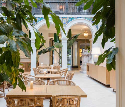 El patio cordobés, visible desde la entrada, es el núcleo central del edificio y acoge el comedor principal. Muestra la arquitectura tradicional con su galería de arcos y pilares decorados con mosaicos originales, a través de los cuales se accede al centro del espacio, desde donde se aprecia la vidriera emplomada de la primera planta y el gran lucernario. En este caso el blanco roto confiere al espacio una mayor amplitud y una gran luminosidad, que se completa con un pavimento pétreo de la misma tonalidad. Los asientos de mimbre y las mesas de madera otorgan al espacio un aspecto ligero y de patio exterior, creando un rincón sereno y claro donde disfrutar de un momento de tranquilidad, en medio de frondosa vegetación.