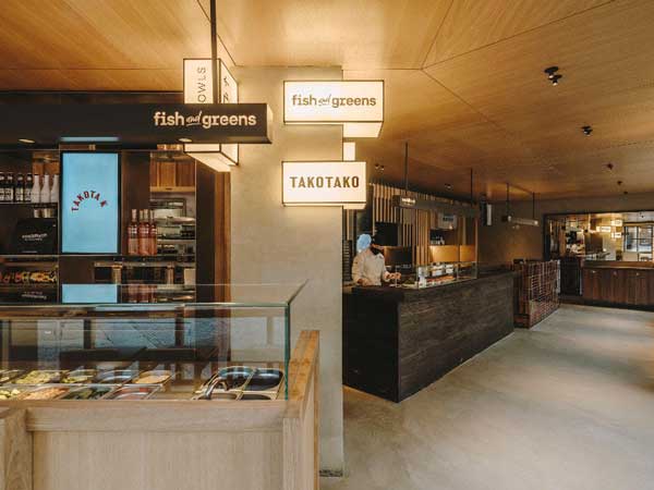 Justo al acceder al local aparece el mostrador más emblemático, el de Sushifresh, fabricado en madera maciza teñida en negro. Al lado, se encuentra el mueble que acoge las propuestas de Boko (tailandés) y Hotto (japonés), con inspiración asiática, hecho de baldosas artesanales a medida que forran todo el mueble en distintos tonos cálidos, terracotas, caramelo y marrones, con aire de los años 70: