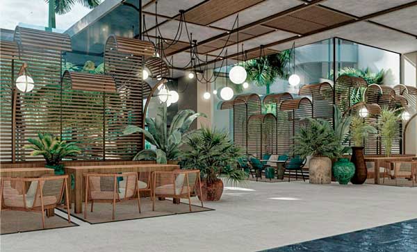 En el diseño del interiorismo destacan elementos naturales, textiles vinculados a la historia local, cerámicas artesanales… El hotel cuenta con numerosos ambientes de encuentro y restauración, con sus zonas exteriores anexas, todos con su propia personalidad, pero con un ambiente común botánico, la vegetación y los colores y geometrías que proporcionan las cerámicas. Los paisajes interiores y las piezas de mobiliario hacen referencia al entorno natural, a la sostenibilidad.