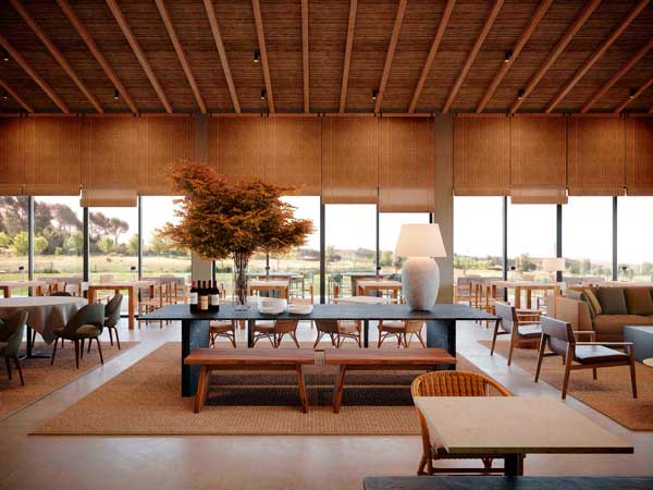 El objetivo de Lagranja Design era celebrar el aspecto social único del juego y el golf, y hacer que el edificio moderno y compacto del hotel resulte «tan acogedor, cómodo y atemporal como la propia Costa Brava».