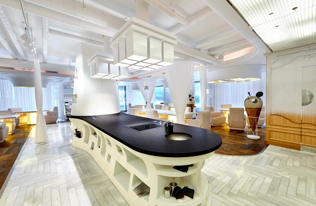 El impresionante showcooking central del comedor de DiverXo, revestido en Dekton