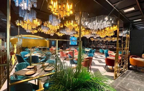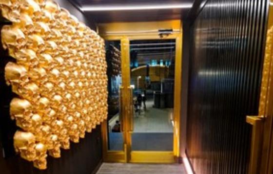 De esta forma, en la entrada principal recibe al comensal una exquisita combinación de negro y dorado: sobre un fondo negro destacan y sorprenden al visitante decenas de calaveras doradas. En lo que respecta al techo, funcionalidad y diseño se dan la mano gracias a la instalación de lamas fonoabsorbentes de Absotec, que garantizan el perfecto confort acústico. Para lograrlo, esta ultima firma ha llevado a cabo un meticuloso estudio de la sonoridad en cada una de las zonas.