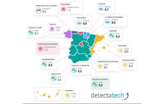 En Cataluña, la pizza ha desbancado a las tapas como la oferta gastronómica más relevante en Semana Santa 2022. A pesar de esto, las tapas siguen siendo muy valoradas en todas las zonas, especialmente en la Región de Murcia y en Aragón, al igual que el pincho, que es muy apreciado en el País Vasco según los comentarios online. Por otro lado, la hamburguesa es el producto que recibe peores valoraciones, con una media de 7,2/10 en Madrid.