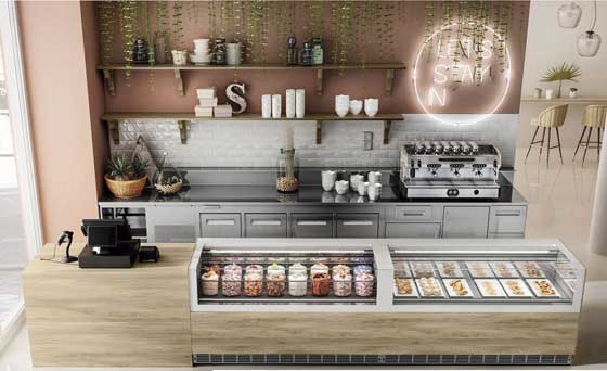 La gama incluye diferentes modelos, atractivos y elegantes, que realzan los helados y los productos de pastelería: