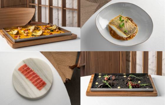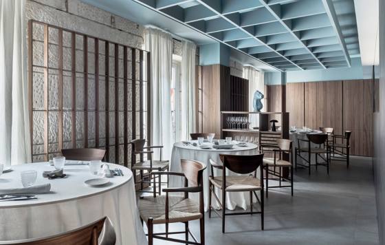 En los salones, los colores neutros y empolvados de los linos se combinan con pieles naturales en los tapizados. La madera se entrelaza con chapa de metal negra, piedra caliza, cristal y una cuidada iluminación íntima en los 560 metros cuadrados del restaurante.