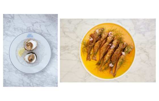Para picar o comer, el huevo encurtido en remolacha, las sardinillas Millesime, la ostra con mignonette y los crackers con mantequilla de miso y brotes.