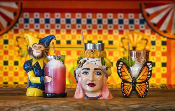 La selección incluye 13 cócteles de autor que se presentan en una vajilla espectacular de vasos pintados a mano con forma de mariposas, monos de circo… La diversión está asegurada.