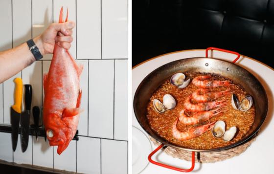 El producto fresco y la vinoteca son, de hecho, protagonistas de un espacio donde reina la cocina abierta con mesa central y con expositor de producto visible desde los dos ventanales que dan a la calle: una selección de pescados y mariscos y también de verduras y hortalizas.