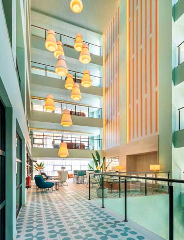 Los seis pisos de altura del lobby lo convierten un espacio de bienvenida vibrante, único y con repleto de luz natural. Los interioristas de Ilmiodesign han sabido aprovechar la singular arquitectura interior del edificio, con pasillos abiertos al espacio central del lobby, para acentuar la espectacularidad vertical.