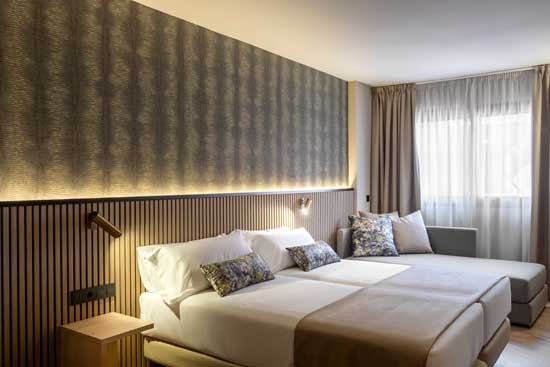 Las habitaciones del hotel Pirámides, en tonos piedra, oro viejo mate, verdes grisáceos y madera mate, están equipadas con cortinas ignífugas de acabados naturales, butacas tapizadas con efecto terciopelo, textiles con motivos florales y sofás cama tan cómodos como una auténtica cama.