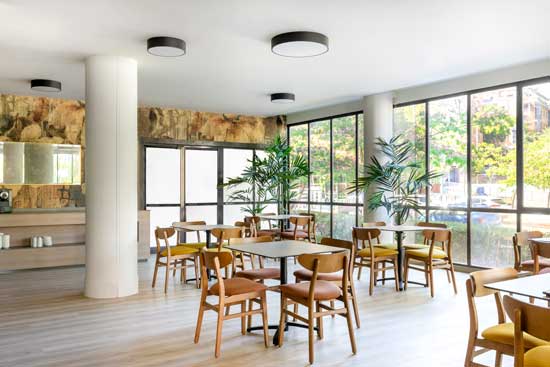 La sala destinada a los desayunos, con vistas a la ciudad a través de grandes ventanales, está decorada con murales florales en las paredes y abundantes plantas. Dispone de versátiles mesas abatibles y cómodas sillas con respaldos de madera y asientos tapizados en tonos mostaza y caldera.