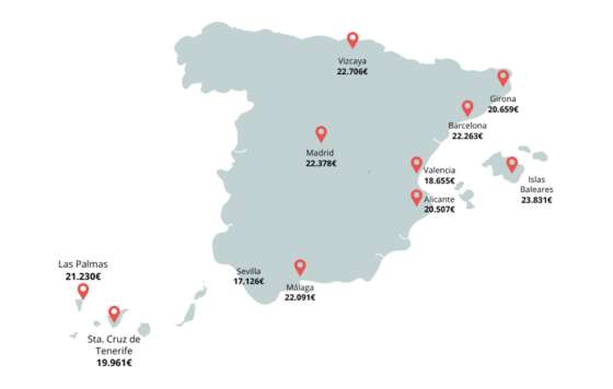 Por un lado, las islas Baleares lideran, con un salario promedio de 23.831 euros anuales, seguidas por Madrid (22.378 €) y Barcelona (22.263 €). Por el lado contrario, Sevilla presenta el promedio más bajo, con 17.126 euros anuales. Estas diferencias evidencian la necesidad de políticas adaptadas a las características locales, incluyendo el coste de vida y la competitividad turística.