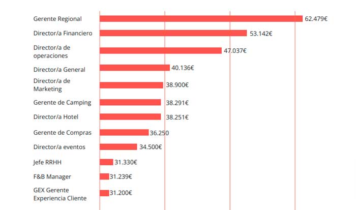 Los roles de alta dirección destacan como los mejor pagados, reflejando la importancia de la gestión estratégica para el éxito del sector turístico. Lideran la posición de gerente regional con 62.479 euros anuales; los directores financieros, con 53.142 euros anuales, y los directores de operaciones, con 47.037 euros anuales.