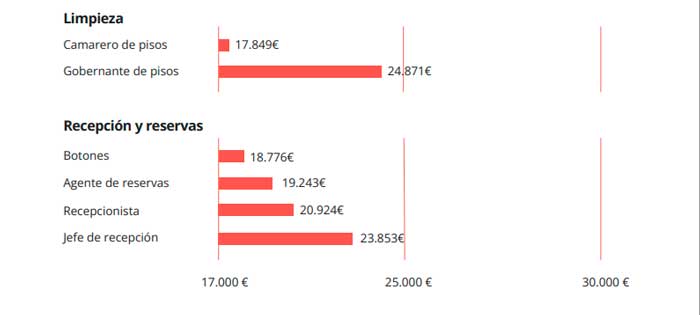 Por otra parte, los roles relacionados con la gestión, como jefes de recepción (23.853 €) o gerentes de mantenimiento (27.285 €), confirman la tendencia de que las responsabilidades administrativas y estratégicas son valoradas con salarios más competitivos.