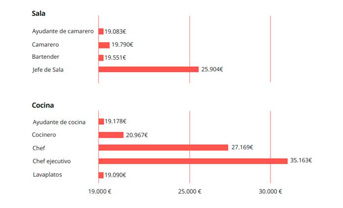 Así, en el ámbito de la restauración, los salarios más competitivos se encuentran en las cadenas (23.467 euros anuales) y en el área de eventos y catering (24.188 € anuales), lo que refleja una apuesta por servicios especializados y de alto valor.