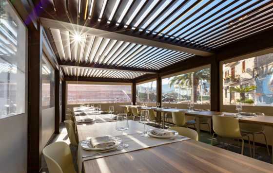 Las tres pérgolas bioclimáticas, modelo P-150 de Saxun, proporcionan protección y ventilación natural, permitiendo la orientación de sus lamas según el momento del día. Además, la terraza también cuenta con una cortina de cristal corredera de seis hojas, personalizada con el nombre y logo del restaurante.