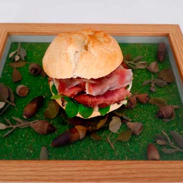 El cocinero, que se siente muy arraigado a la cultura vasca, ha elegido para su burger campeona ingredientes locales del idílico Valle de Arratia, con carne madurada picada a mano, bacon laqueado en soja y sweet chilli; una fusión de quesos (cheddar, azul, parmesano e Idiazábal; una yema crujiente y líquida; cebolla con boletus y reducción de PX, y pan pretzel de semillas de Lantmännen Unibake, patrocinador del concurso.