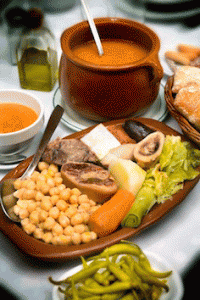 Los garbanzos se acompañan de piparras, cebolletas y salsa de tomate con comino, ajo y orégano; una fuente de verduras con patatas nuevas y finalmente las carnes, con todos los «sacramentos»: morcilla casera, chorizo de sarta, huesos de caña, tocino ibérico, carnes de añojo y pollo y las sabrosas puntas de jamón, servidos al centro de la mesa, para que cada cual disfrute más y mejor de lo que le apetezca.