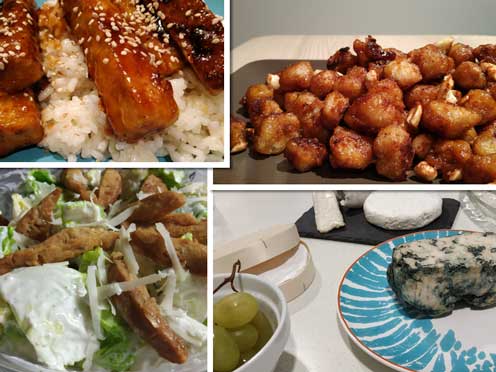 Platos veganos, deliciosos y apetecibles, para la carta de un restaurante: tofu agridulce, soja texturizada con almendras, ensalada césar y quesos vegetales