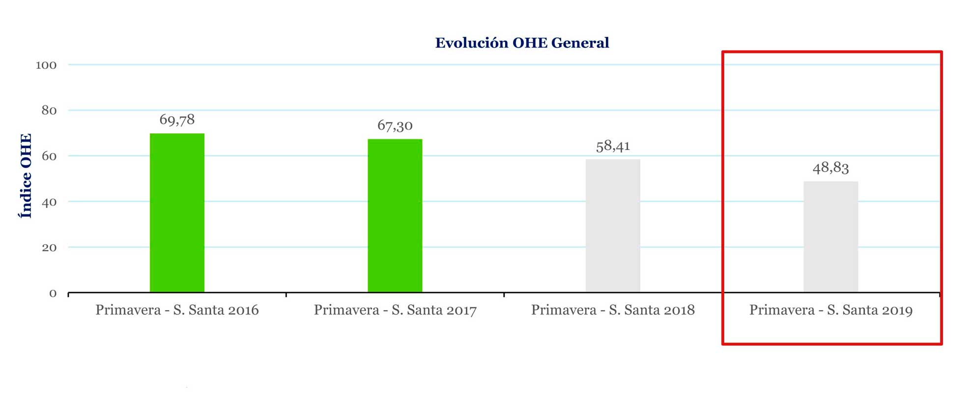 Así, el índice OHE General de la temporada Primavera – Semana Santa 2019 se sitúa en los 48,83 puntos, lo que refleja estabilidad en el sector, que se ve marcado por un ligero empeoramiento de las expectativas tras los excelentes resultados obtenidos en las temporadas primaverales anteriores.