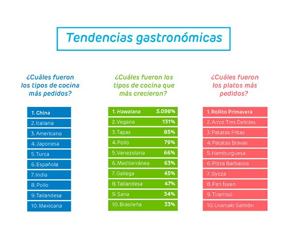 El resto del ranking de los cinco tipos de comida con mayor crecimiento lo completan la española con las tapas, con un crecimiento del 85%, las recetas de pollo (79%) y la comida venezolana (66%).