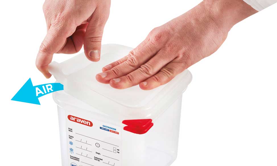 Estos nuevos contenedores herméticos, con medidas GastroNorm, disponen de una una tapa que permite hacer cierto vacío en el interior simplemente presionando desde el centro, lo que garantiza una hermeticidad total y contribuye a reducir la oxidación del alimento, prolongando su duración y reduciendo el nivel de mermas.