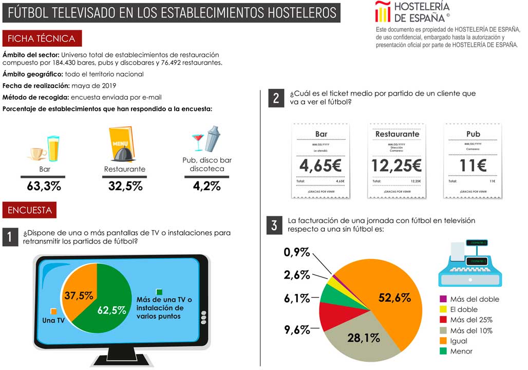 El estudio realizado por la patronal Hostelería de España sobre el impacto del fútbol muestra que el 52,6% de los locales encuestados no aprecia grandes diferencias entre jornadas de grandes partidos de fútbol y en las que no.