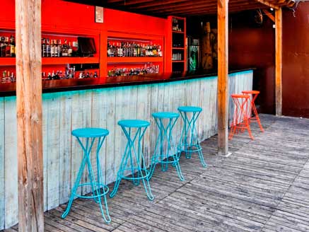 Sin abandonar el estilo minimalista, que se emplea en muchos espacios exteriores para lograr luz y amplitud, en verano se busca contrastar las escenas sobrias con pequeños detalles de color y personalidad, como estos taburetes Madrid en colores azul Agata y rojo Geranium, que alegran la barra:
