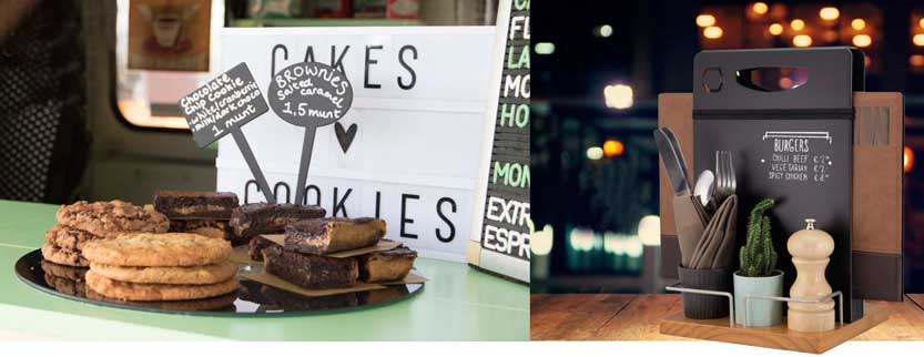 Más posibilidades: incluir en los buffets o en la barra pequeñas pizarras para indicar un sabor o ingrediente, o el nombre de la bebida, o una “happy hour”. Cuadradas o redondas, de mayor o menor dimensión, personalizan cualquier espacio: