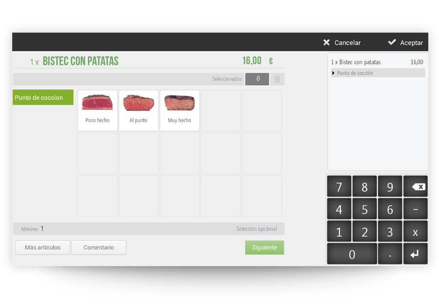 - Añadir modificadores a los artículos: una funcionalidad que ayuda al camarero a registrar el pedido proponiéndole modificadores personalizados pre-configurados para cada producto: en el caso de las carnes, por ejemplo, sería el tipo de cocción: