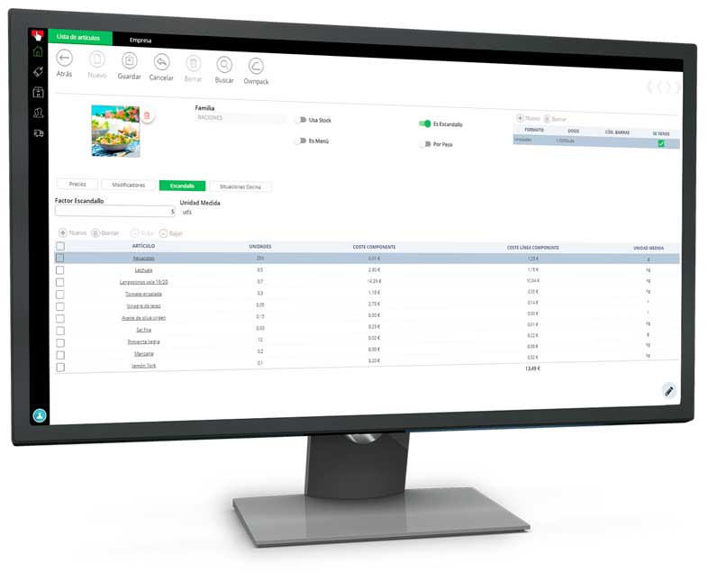 - Elaborar escandallos de los platos: permite definir la composición de cada plato para tener un control de los costes y del stock de las materias primas. Define el precio de venta de cada plato en función de su coste de producción.