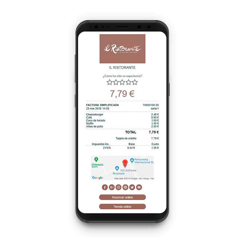 - Los clientes, siempre conectados: al realizar una venta se envía un ticket electrónico automáticamente al email de los clientes. En este ticket los clientes podrán consultar la compra, opinar sobre su experiencia en el restaurante, consultar la información del mismo y consultar su ubicación conectándose a Google Maps. También enlazar con un link sus redes sociales y conectarse directamente con PortalRest para realizar reservas de mesas o compras on-line.
