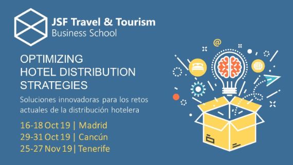 Ante el nuevo escenario de cambio del sector turístico la venta hotelera se vuelve cada vez más complicada. ¿Cuáles son las soluciones innovadoras que se presentan en la distribución hotelera? Esta cuestión protagoniza las jornadas de JSF Travel & Tourism Business School.Las próximas: del 29 al 31 de octubre en Cancún y del 25 al 27 de noviembre en Tenerife.