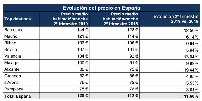 Según el estudio de HRS, el precio medio por pernoctación en España ha subido un 11,6% con respecto al mismo trimestre de 2018, situándose en 125 € por noche. Barcelona, Madrid, Bilbao y Sevilla encabezan el ranking las ciudades con mayor volumen de contrataciones, destacando especialmente el crecimiento del precio promedio por noche en Barcelona, con un aumento del 12,50% y una tarifa media de 144 euros.