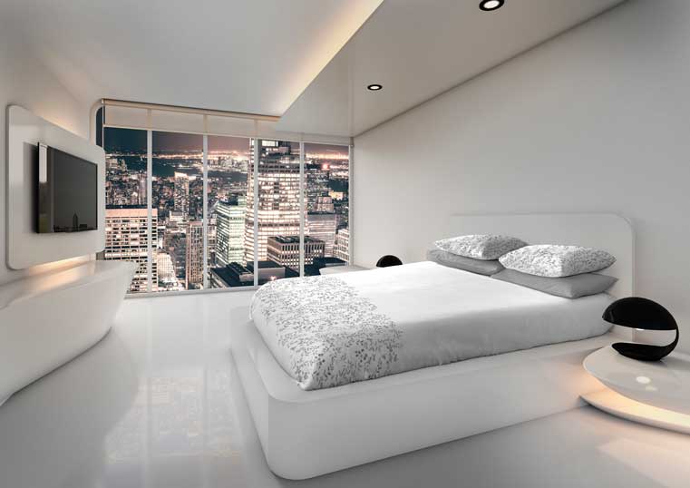 Un look futurista para esta habitación de hotel en la que la ropa de cama de Vayoil aporta un sutil toque de color