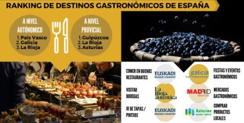 El estudio también presenta el ranking de los destinos gastronómicos favoritos de los españoles a nivel autonómico y provincial, situando a País Vasco como el destino gastronómico favorito de los españoles, seguido por Galicia y La Rioja. En términos provinciales, han destacado, por este orden, Guipúzcoa, La Rioja y Asturias.