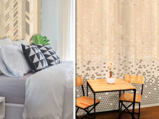 Paneles con la apariencia y el tacto de la madera natural, y decorados en impresión 3D, para dar calidez a la habitación del hotel o a la cafetería
