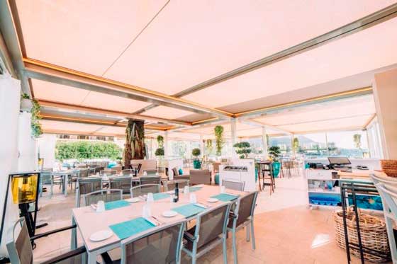 Para el área de mesas exterior se instalaron siete pérgolas Isola 2 con estructura en el tono plata anodizada y lona de PVC blanca. Debajo del techo de las pérgolas se han agregado toldos horizontales Gennius Tens en tejido Soltis 92 microporoso, para brindar sombra y utilizarlos cuando la lona de PVC esté abierta.