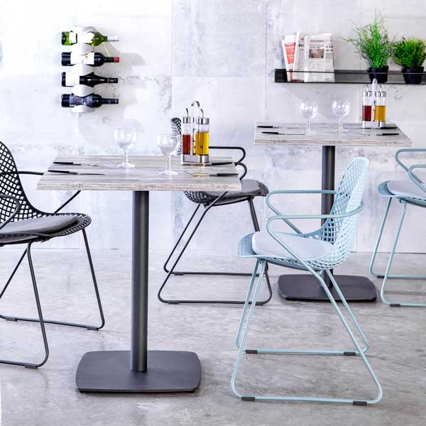 ¿Y las mesas? Las diferentes colecciones Grosfillex de mesas combinadas con sillas ofrecen múltiples posibilidades. Por ejemplo, la nueva mesa con tablero Lamidur by Severin y el pie Domos, combinada con la silla Ramatuelle’73. forman un conjunto de diseño elegante para uso profesional.