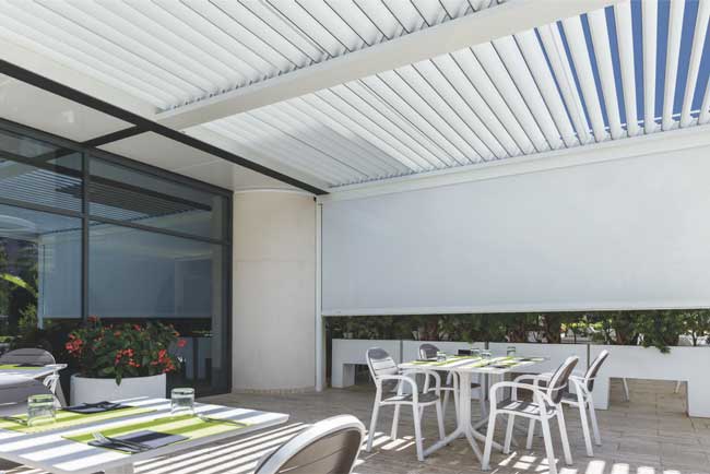 Wind screen en una pérgola bioclimática de Saxun instalada en la terraza del hotel Meliá Benidorm