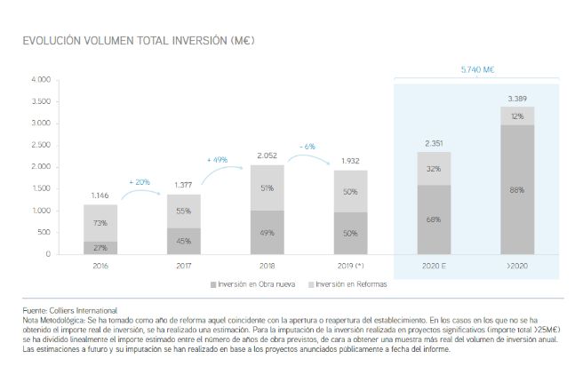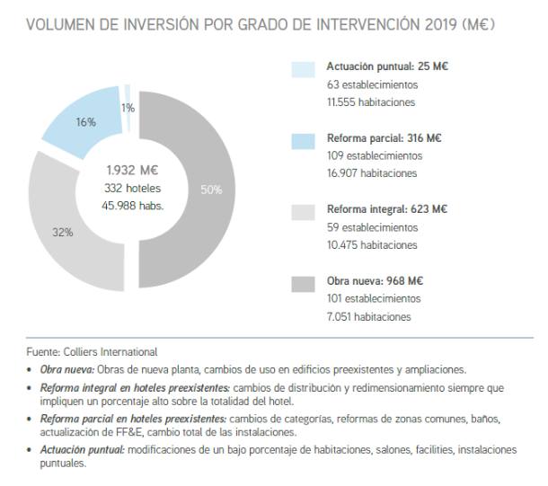 España cerrará este año con una inversión de 2.000 millones de euros destinada a reformas hoteleras y construcción de nuevos hoteles. El 42% de este volumen se concentra entre Baleares y Madrid, según un informe de Colliers International. Atención al segmento urbano:en los últimos tres años ha registrado un crecimiento medio anual de más de un 40%.