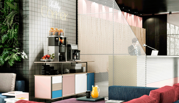 Un Healthy Corner junto a la recepción del hotel con el exprimidor Z14 Nature Contactless de Zummo