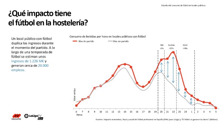 […] Según un informe elaborado por LaLiga y Mediapro, el 75% de los aficionados españoles acude asiduamente a un local de ocio a ver el fútbol, actividad que cada año genera más de 1.226 millones de euros de beneficio a la hostelería y 15.000 puestos de trabajo en el sector. […]