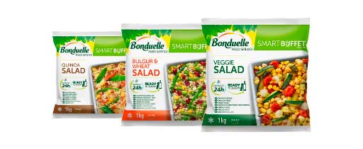 Se ofrecen al canal horeca congeladas, en bolsas de 1 kg, y destacan por su fácil manipulación, con lo que optimizan al máximo el tiempo de los chefs. En la web de Bonduelle Foodservice se ofrecen ideas específicas para de aliño para cada tipo de ensalada.