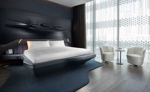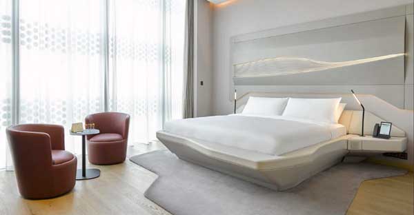 ME Dubai cuenta con 74 habitaciones y 19 suites, como la Passion Suite, Personality Suite, Vibe Room o la ultra-lujosa ME Suite. Todo ello con la originalidad del diseño de Hadid, que reinventa el equilibrio entre lo sólido y el vacío, lo opaco y lo transparente, lo interior y lo exterior.