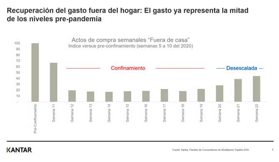 Según los datos de Kantar, con la desescalada las ocasiones de consumo fuera del hogar han empezado a crecer de manera progresiva, y llegan ya a niveles de hasta el 44% frente a datos pre-confinamiento