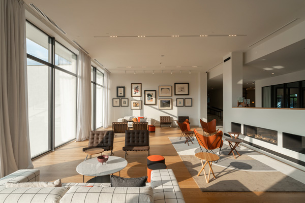Los interioristas han optado por elementos icónicos de mobiliario del siglo XX, como la silla Barcelona y la silla Butterfly, dos clásicos atemporales, que combinadas con sofás y pufs tapizados consiguen un ambiente muy interesante.