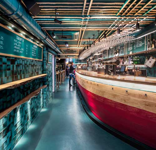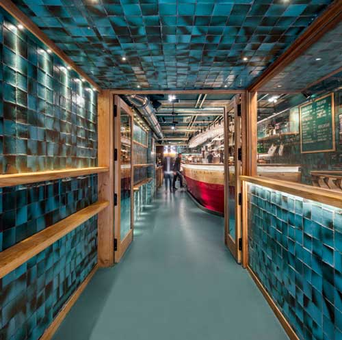 El bar, en la planta baja, es una clara referencia al puerto y su colorido. Las piezas cerámicas artesanales de color turquesa, diseñadas específicamente para el local, logran un particular efecto acuático a través de su intenso color turquesa, con sus imperfecciones y su brillo.